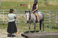 Na červencovém kurzu jsme si dali (kromě obvyklých cvičení na změknutí koní a na kontrolu a bezpečnost nejen při vyjížďkách) za cíl práci na nakládání koní do přívěsu, posílání do roztodivným míst a na podivné povrchy a vstup do řeky – udělali jsme si krásnou vyjížďku, na jejímž konci všichni koně brouzdali Divokou Orlicí.